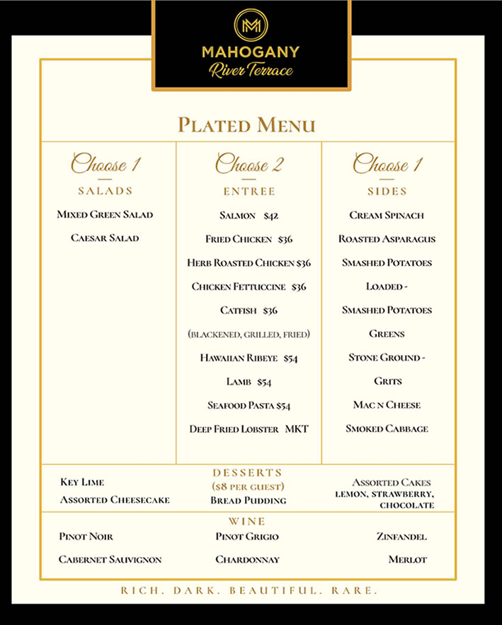 Mahogany River Terrace provides onsite and offsite catering. We will customize any menu for any occasion. Our culinary team are available for consultation. Thank you for considering Mahogany River Terrace for your catering needs.